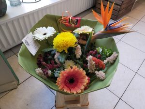 Een bloemstuk is ook altijd mogelijk. Die staan niet klaar in de winkel maar zijn altijd te bestellen.