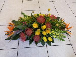 Dat is een rouwbloemstuk waar de ene kant rond is en uitloopt naar een puntje zie de voorbeelden.