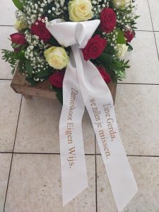 Rouwlinten kunnen wij zelf printen met de tekst naar keuze en kleur lint kan u ook nog kiezen, een rouwkaartje is ook een mogelijkheid.