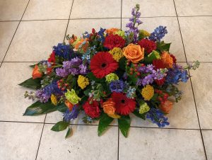 Is een hand gebonden boeket met een platte achterkant, zodat het neergelegd kan worden bij de kist en het graf.