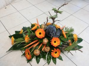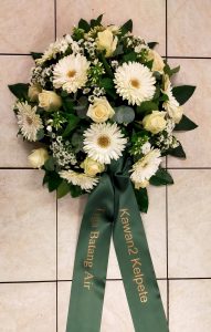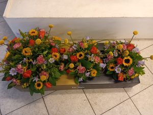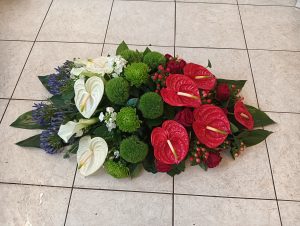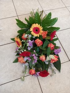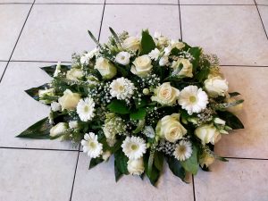 Dat is een rouwbloemstuk waar de ene kant rond is en uitloopt naar een puntje zie de voorbeelden.
