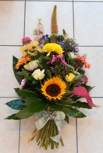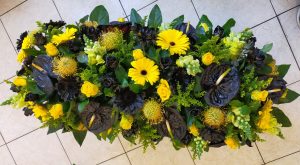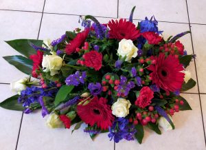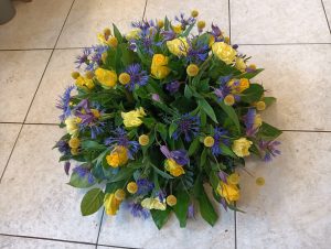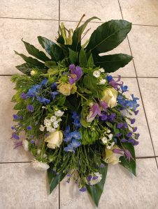 Is een hand gebonden boeket met een platte achterkant, zodat het neergelegd kan worden bij de kist en het graf.
